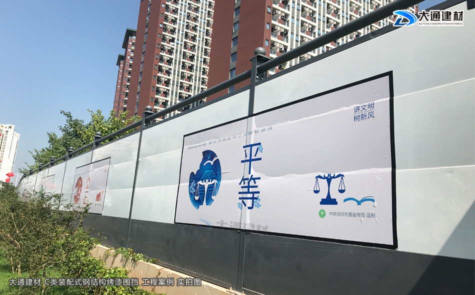 深圳市大通建材有限公司專(zhuān)業(yè)生產(chǎn)烤漆鋼圍擋源頭廠家,大通烤漆鋼圍擋C款符合深圳市標(biāo)準(zhǔn)是一款新型裝配式圍擋,拆裝方便、美觀大氣、綠色環(huán)保、安全穩(wěn)固,在施工時(shí)可以起到了一定的隔離危險(xiǎn),安全防護(hù)作用,已廣泛應(yīng)于深圳各區(qū)域的工程施工項(xiàng)目。