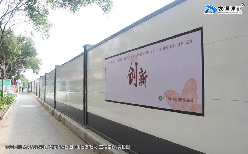 大通建材A類裝配式鋼圍擋,堅持深圳質量,關注城市美學,培育精益求精的工匠精神,結合深圳開放、創新、現代、濱海的城市的特征和公益宣傳的要求。提供具備不同區域環境特點的外觀設計方案,外觀顏色可以是白色+深灰色烤漆擋板(亦可是全白色烤漆擋板),美觀大氣的現代風格; 再結合城市區域特點,分片區、分道路、分街景各自選用同類風格圍擋,營造美觀、整潔的城市環境的同時,實現圍擋風格區域性的協調統一。