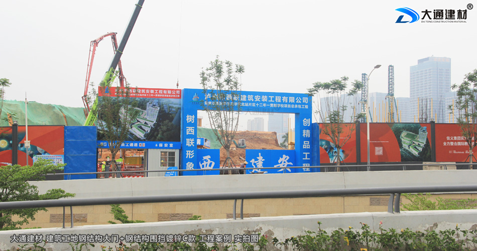 瀘州市西聯建筑安裝工程有限公司在深圳市龍華區北站片區學校項目工程,選用了深圳市大通建材生產的鋼結構工地大門為項目部大門。