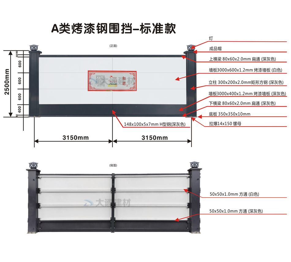大通建材生產(chǎn)的施工圍擋成品規(guī)格尺寸:6.3米長x2.5米高 (其它尺寸的圍擋高度可按需定制)如下圖