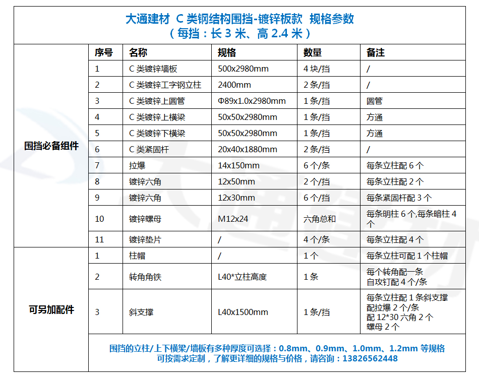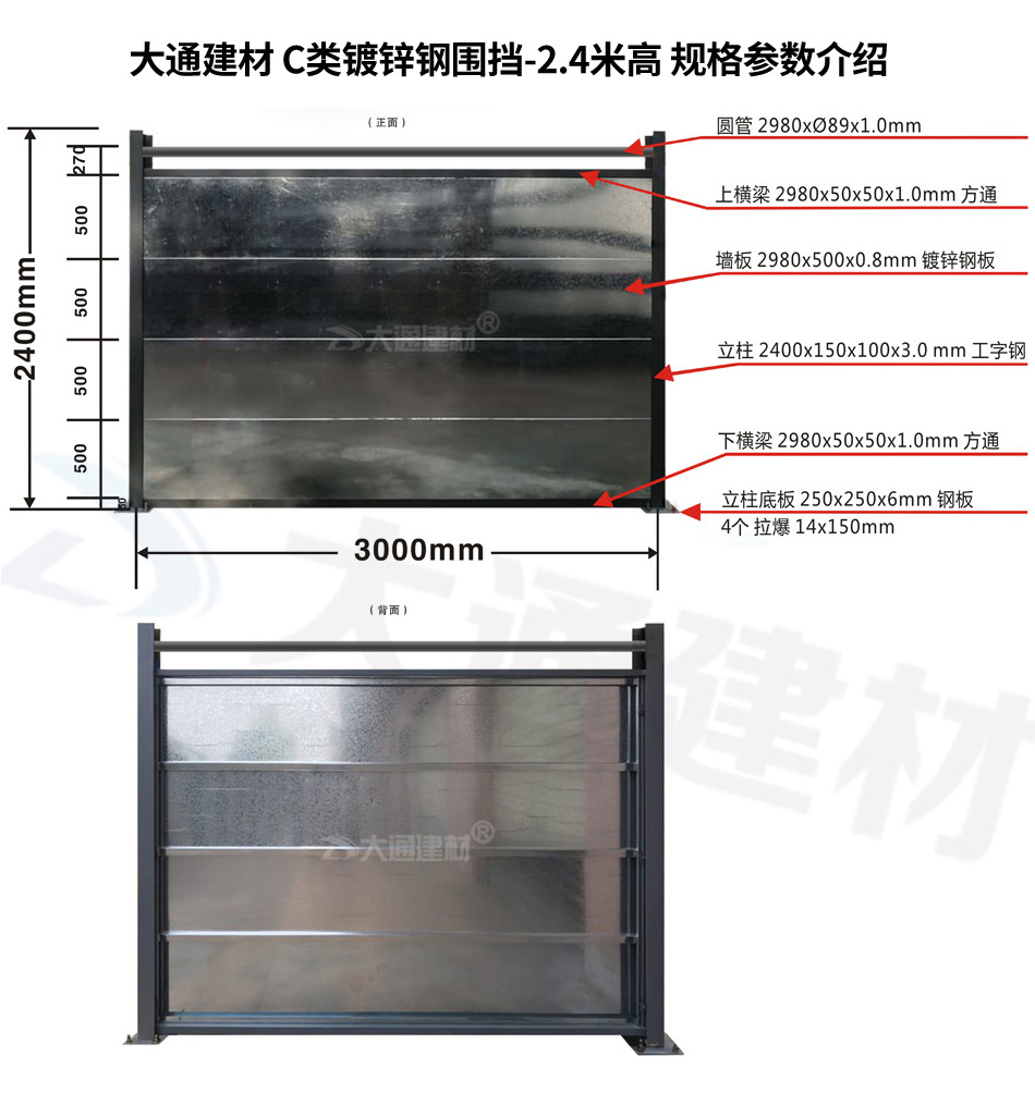 深圳大通建材C類裝配式鋼圍擋-鍍鋅板款通常作為圍墻護欄使用,起隔離防護作用。常規一擋的長度是3米、高度是2.4米和2.5米,若沒有特殊要求的項目工程按性價比來選擇鍍鋅鋼板圍擋款式建議是選擇鍍鋅鋼板圍擋c款的2.4米高的工字鋼立柱的普通款。如果對高度要求至少要2.5米高的工程,這種情況下建議使用H型鋼立柱鍍鋅鋼板圍擋c