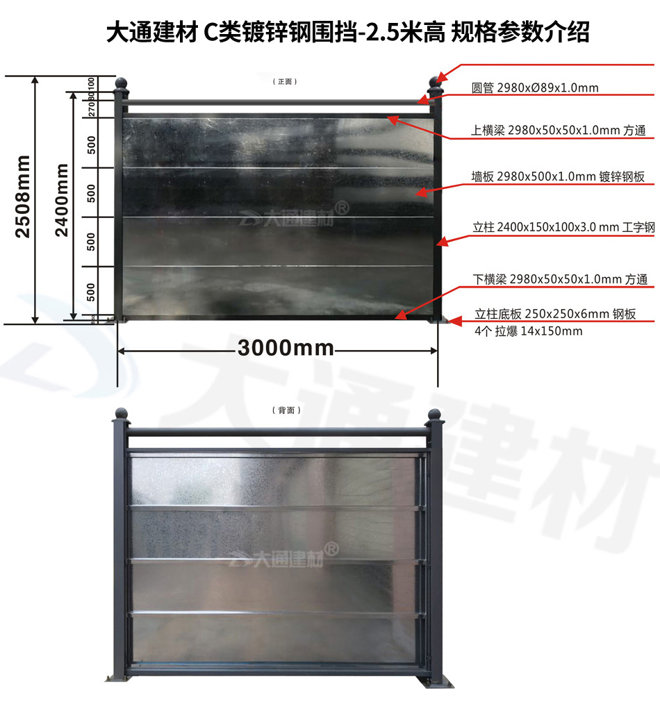 深圳大通建材 C類裝配式鋼結構圍擋-鍍鋅板款 通常作為圍墻護欄使用,起隔離防護作用。常規一擋的長度是3米、高度是2.5米,適合對圍擋高度要求至少要2.5米高的工程項目選用